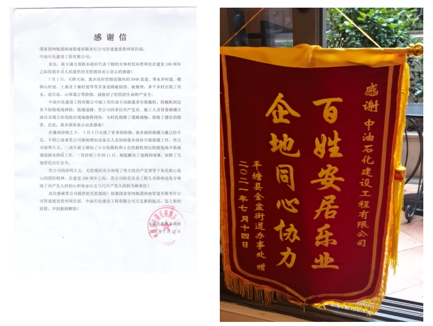 来信的分别是卡蒲毛南族乡政府和平塘县金盛街道办事处。他们在信中真挚地感谢我公司项目部在当地遭遇洪水、泥石流地质灾害,人民群众生命财产受到威胁的时候挺身而出,主动担当。持续十多天先后派出多台装载机、挖掘机为当地清理被毁道路,排除塌方隐患,直至堵塞彻底解决、险情彻底排除。